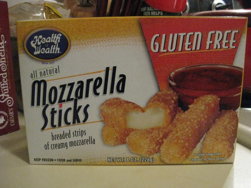 I had gone inside for one thing. A gluten-free baguette. Which…they were sold out of. To quell my rising anger at not being able to get what I intended, my roommate suggested I pick out something else to try…for blogging purposes, of course. I was reluctant, but the more I lingered, the more I wanted to try something else. So, I was scanning the shelves and finally went over to the freezer section. There, as if a beacon of light from Heaven itself shown down upon them, sat a box of gluten-free mozzarella sticks by a company known as Health is Wealth.