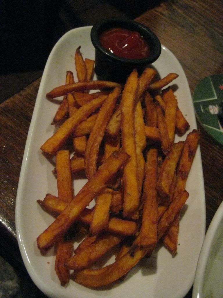 We chatted a little bit, reminiscing about Ireland for awhile, and when our food arrived, we settled in to eat. My two friends totally dug the fish and chips. I stole one of the fries from my roommate’s plate and immediately regretted getting the sweet potato fries. While I am a sucker for sweet potato fries, the regular thick-cut wedge fries were so amazing. Weird for me to say, as I usually can’t stand wedge fries. My sweet potato fries were decent though. Not soggy. Fresh cut, seasoned great. They were just…what they were – sweet potato fries. Their only handicap was that they were just…not as great as the regular fries. So, next time I go to Fadó, I know to stick with regular fries because…they were amazing. I had to steal a few more as I was eating because they just blew the sweet potato ones out of the fryer. *giggle*