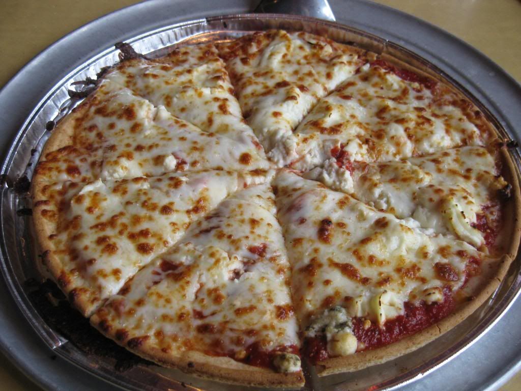 We decided to split one of the vegetarian signature pizzas on the menu at Puccini’s Smiling Teeth. It was the Paparazzi Pizza ($11.55), which we (of course) ordered with the gluten-free rice flour pizza crust (a 10-1/2 inch pizza for the same price as a regular medium (12 inch) pizza…not bad!). So what all is on the Paparazzi Pizza? Cheese. Lots of cheese. It starts with Puccini’s very own regular cheese blend, and adds to the mix Gorgonzola and Ricotta. A pizza that not only satisfied the gluten-intolerant side of me, but the vegetarian side too. We placed our order and after a short wait, it arrived in all it’s heavenly, cheesy glory.
