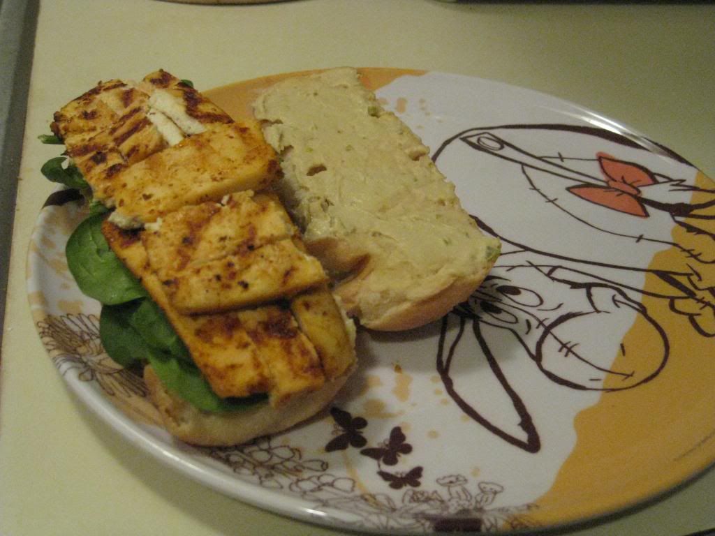 So, for my foray into sub sandwich making, I toasted up these rolls and then grilled some tofu that I marinated in the Thai sweet red chili sauce. When the tofu was done grilling and the bread was oven-toasted, I sliced the rolls in half and coated each with a schmear of jalapeño hummus. A bed of spinach was placed on one half before being topped with strips of my marinated and grilled tofu. The other half of the bread topped it off…and bam…vegetarian sub sandwich!