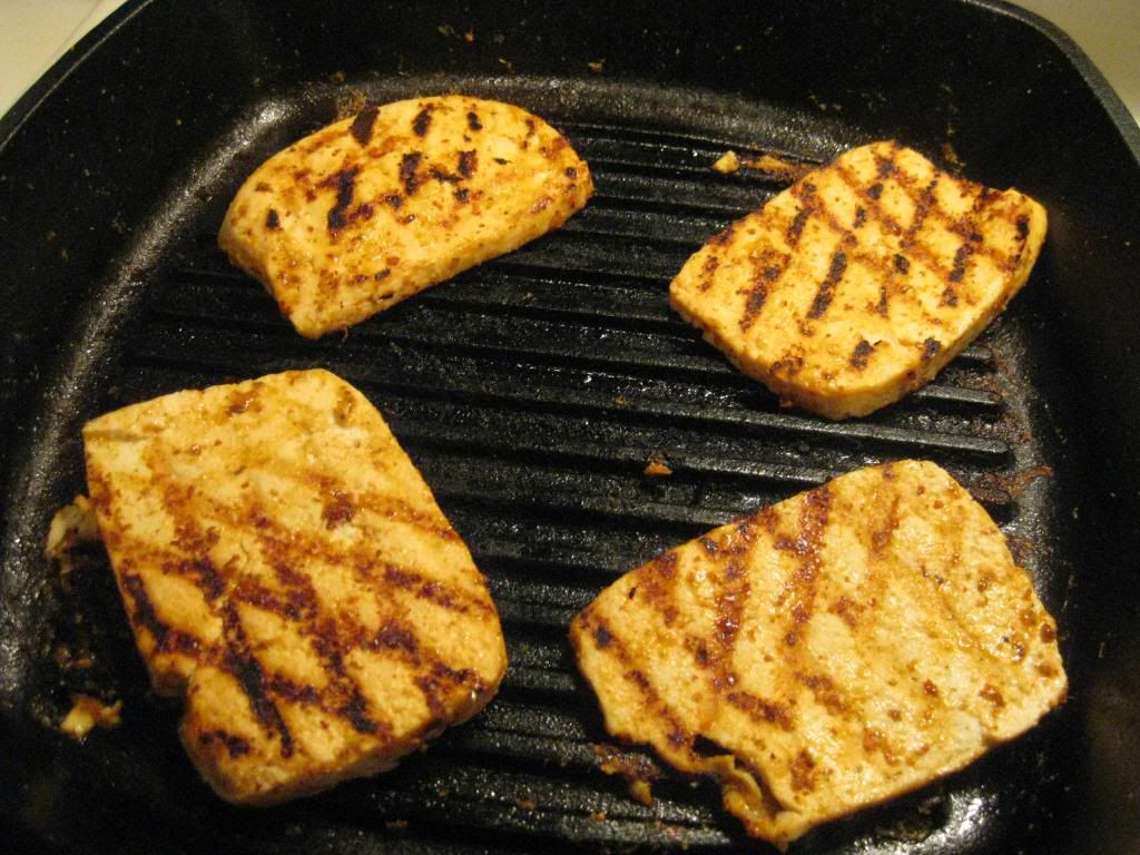 Take marinated tofu and place on hot grill, allowing to cook on one side. Flip and use left over sauce to brush over the tofu as it grills. Flip a couple more times to get grill lines and heat tofu throughout. Set aside.