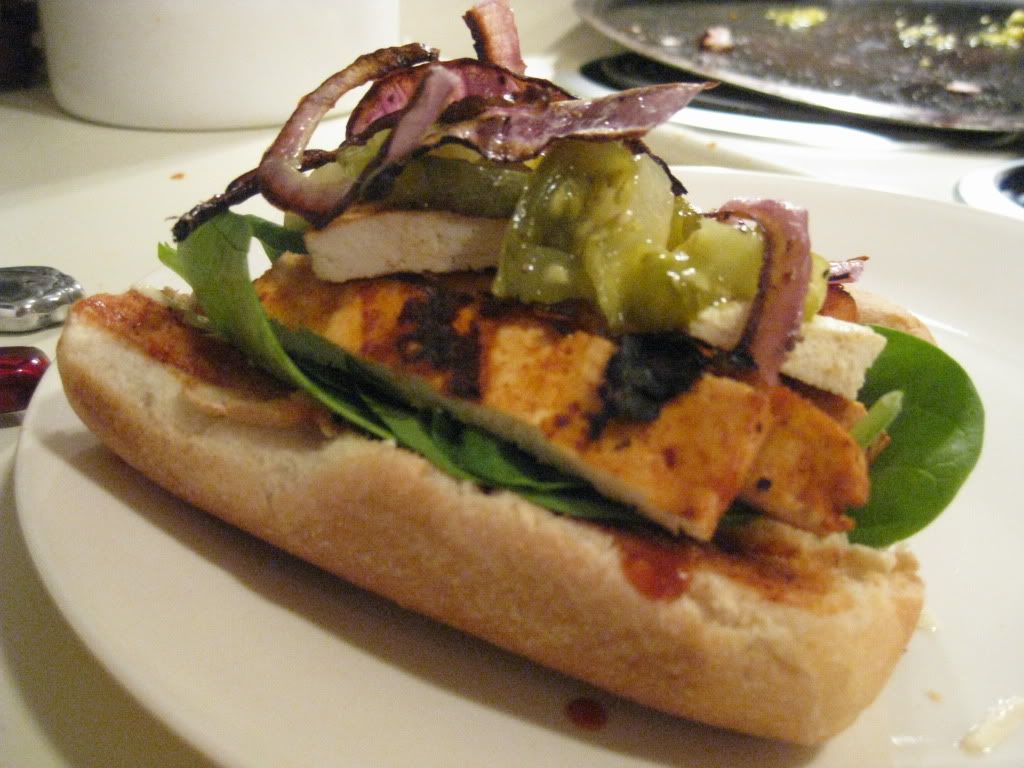 I dug it out of my pantry and quite happily filled a bag with a bit of it. The slice of tofu went in and a little more sauce was added. The bag was given a good massage and shake, until everything was coated and then placed in the refrigerator overnight. In the morning, I flipped it over and let it sit until dinner time. Then, onto my cast iron grill pan the tofu went, being brushed with a bit more of the sauce until it was perfectly grilled. I spread a bit of the sauce over a gluten-free sandwich roll, topped that with a bit of vegan mozzarella cheese, which I then melted in the microwave. Over that went some spinach, the grilled tofu, the oven roasted tomatoes and finally the red onions.