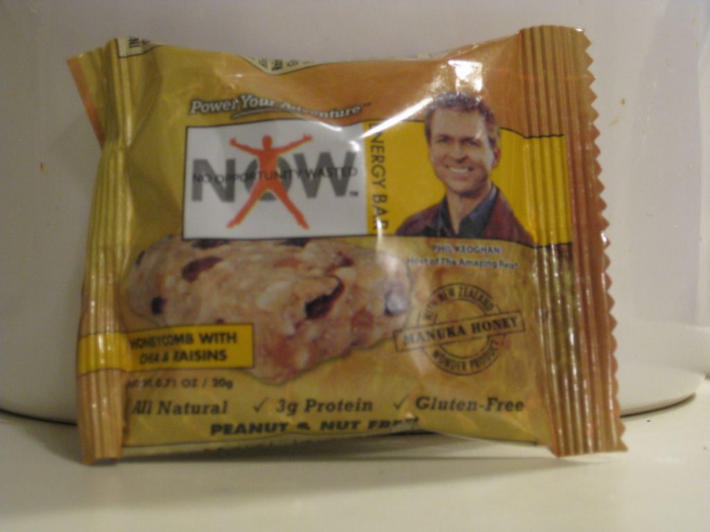 So, imagine my elation when I attended the big Gluten-Free Expo in Birmingham, Alabama and got a couple samples of some energy bars. Yeah…I was pretty psyched. The product is Phil Koeghan’s NOW (No Opportunity Wasted) Energy Bars. And I was given the Honeycomb with Chia and Raisins variety.