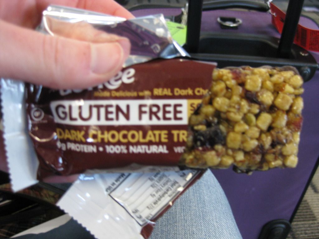 Being gluten-free and traveling. Especially when the tummy rumbles hit while sitting at an airport. There are few, if any, gluten-free options as far as restaurants go…except, perhaps, a salad. Maybe. If it’s not pre-made with bits of pita or croutons in it. A fruit cup, perhaps. But that’s not going to fill you up.