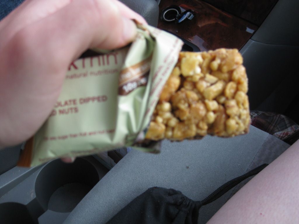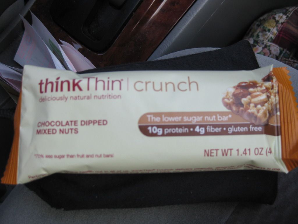I was prepping to run in a 5 mile race, away from the city I live in. Travel. Not far. It just meant an early morning. So I ate some cereal at my apartment before leaving and figured I’d eat something about an hour before the race. The question was…what. For 5K races, I’ve been using the snack-size LäraBars. But this was 5 miles…so I didn’t think that would keep me feeling full long enough if I ate it an hour out and then ran for at least 45 minutes. So…reaching into my drawer of gluten-free running goodies, I emerged with a thinkThin Crunch Bar that I got at the Making Tracks for Celiacs 5K race in Birmingham, Alabama.