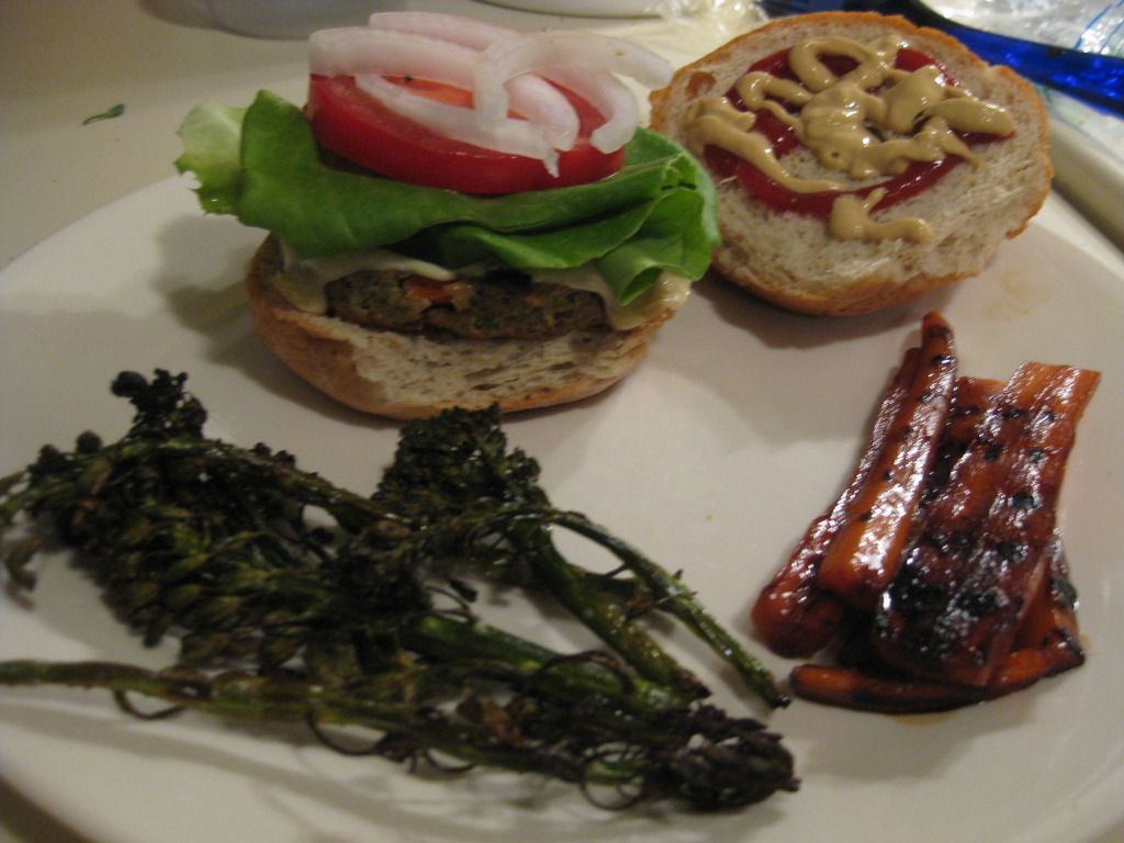 My veggie burger was being cooked in my skillet, and my veggie sides were in the oven and on my grill pan. As they were finishing up, I pulled out a Udi’s Whole Grain Hamburger Bun to warm up in the microwave for a couple of seconds. What emerged was soft and delicious, by the way. When first taking it from the container, the bun seems a bit too…sturdy. But a quick flash in my microwave remedied that. Press on the top and it bounced back.