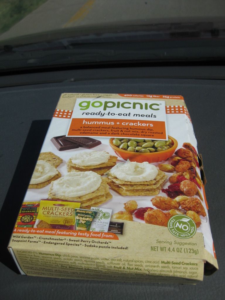 Thankfully, I came prepared with a couple of varieties of GoPicnic meals. I had a couple that I got for free from the Gluten-Free Expo in Birmingham, Alabama. But they included hummus and I was unsure of whether or not my roommate would eat that as she has a love/hate relationship with hummus. So, when they ran a 1/2-off special on GoPicnic’s Web site, I ordered two of the Peanut Butter and Crackers for her, part of their All-Natural, Healthy Meals. For me, I was quite content with my Hummus and Crackers pack. Hers is not gluten-free. But the Hummus and Crackers one is.