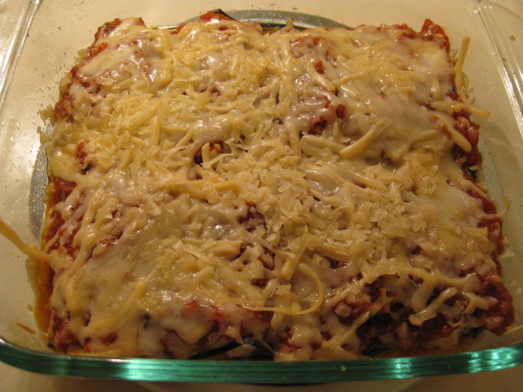 Spoon 2 cups of the marinara sauce over the eggplant rolls and sprinkle with the mozzarella and Parmesan cheese.