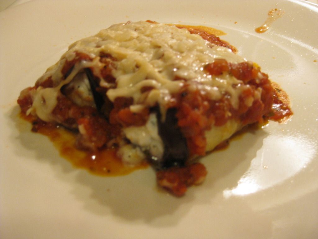 Even better, once I arranged the 8 rolls of eggplant, sauced it, cheesed it, and allowed it to bake, it came out perfectly. I mean…what’s not to love about baked, tender eggplant rolled around a delicious blend of cheeses and topped off with sauce. I even used my homemade marinara sauce from my previous post for this dish. Perfect pairing.