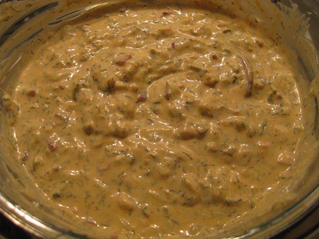 In a small mixing bowl, combine the olive oil, garlic, dill and spices together. Add in the thick yogurt and stir well.