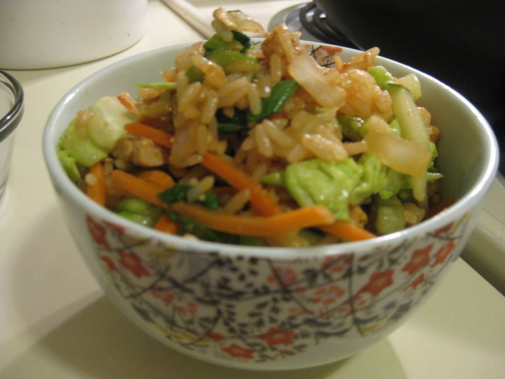 Once the rice is heated through, add the bok choy and cabbage and cook for 1-2 minutes more. Then add in the cucumbers and carrots. Cook for 1 more minute, then remove the wok from the heat. If using peanuts, add to the wok and give the contents a good stir.
