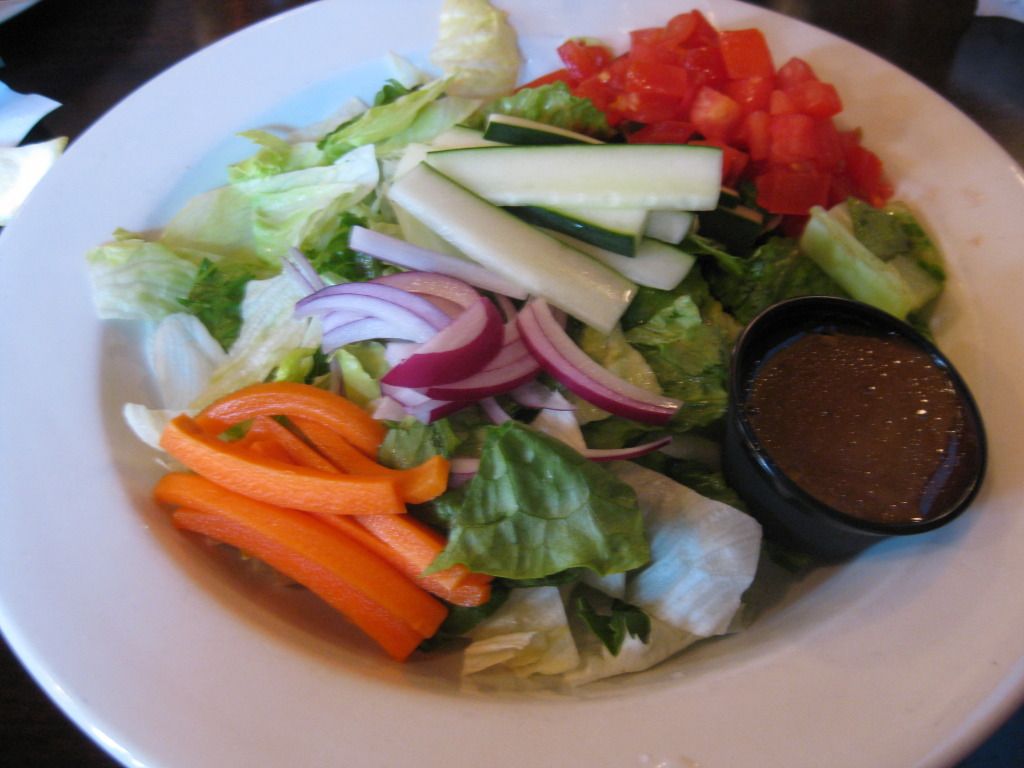 When food arrived…I was actually surprised at the serving sizes.  As my salad was only $5.99, I got a huge containing chopped Iceberg & Romaine lettuce, cucumbers, tomatoes, red onions and julienne carrots.  The dressing was kept to the side so I could add it myself (thank you!).  It was a lot bigger than I imagined…but it looked fresh and delicious.  And it was…but there was nothing that really set this salad apart from one that I could make at home.  In fact…those are the usual suspects in a salad I make at home (minus the lettuce…as I’m a spinach girl).  So…yeah…not so hugely impressed with the salad, but it was fresh, crisp, and edible.  Nothing wrong with it…but…nothing that set it apart either.