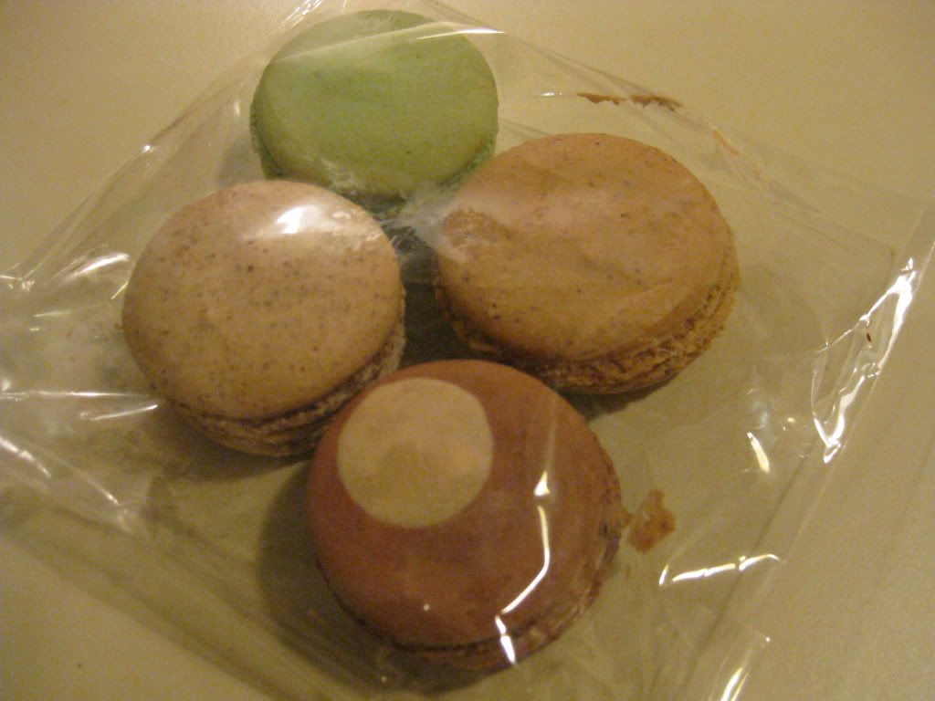 The macarons, however, made the journey back to Louisville with us. And last night, I decided that they would be perfect to have for dessert. After polishing off dinner and doing up the dishes, I pulled out the macarons and dished out each of our chosen ones. Cathy got the green minty one and the deep brown chocolate/peanut butter one. And I got the two lighter colored ones. I was looking forward to trying these out for the first time.