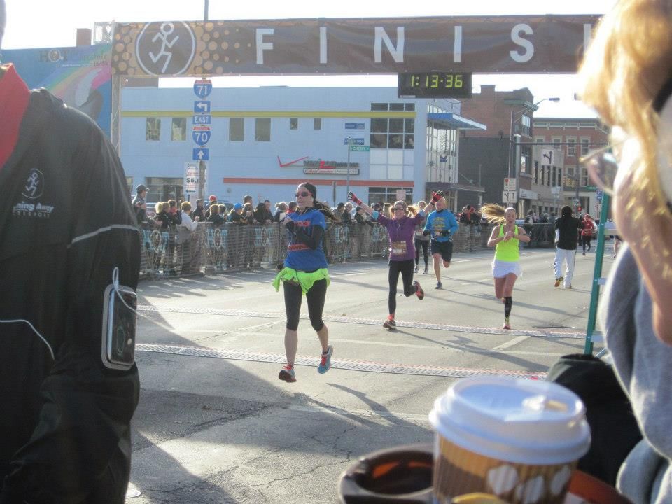 The last bit of the race always seems the longest. I don’t know why. But, I was going to make this happen. Mile 7 and Mile 8 were flat and easy. I bypassed the water stop there, but got caught up in the crowd. And then…somewhere just at the start of Mile 9…we get a hill. Yeah. That’s just evil. So, I push myself up the hill and just continue on. I know I’m getting close because I’m running past the convention center. I can hear announcements being made. I round another corner and there it is…the Finish. I can see runners going through and I pick up my pace as much as I can. We all know that I am not a sprinter…so my finishes are never with a flourish of speed…but I do try to push harder at the end. I passed by the DJ that was keeping the crowds going and the runners encouraged near the finish and blew on through, catching sight of Cathy and Jenn on the side, waving my sign and cheering.