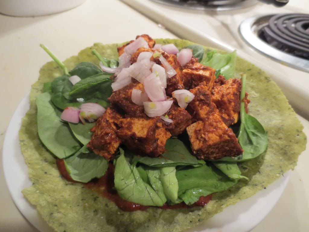 What is Triple T, you might ask? Well, it’s Tandoori Tofu Tortilla Wrap. And I added some of the Bibb lettuce and baby spinach in my crisper drawer, as well as chopped up some shallots to add a bit of texture. All I needed to do was get that tandoori tofu working. And that was easy!!