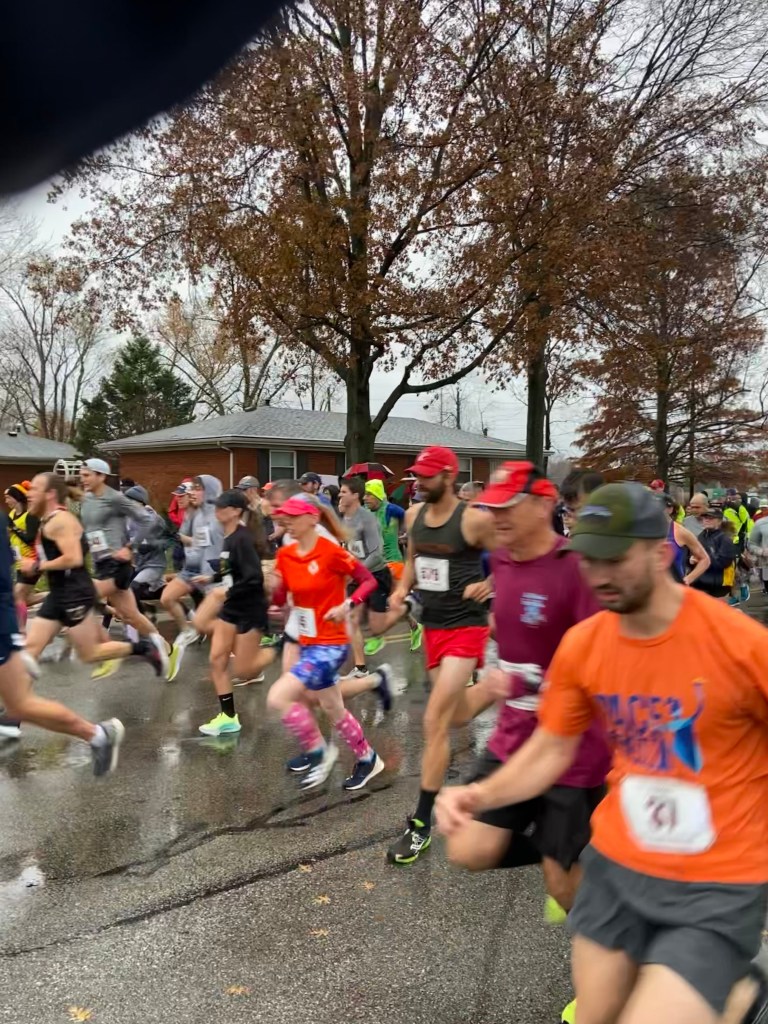 Woke up Thanksgiving morning to cold rain. It was still shorts weather though, so I couldn’t be too mad. This just meant that I stayed in the apartment until the very last moment. As I have mentioned in every blog about this race – the start line is basically at the base of my apartment complex. It’s the least stressful race of the year. It’s a one minute walk at most…but this year faster because rain makes me move faster.