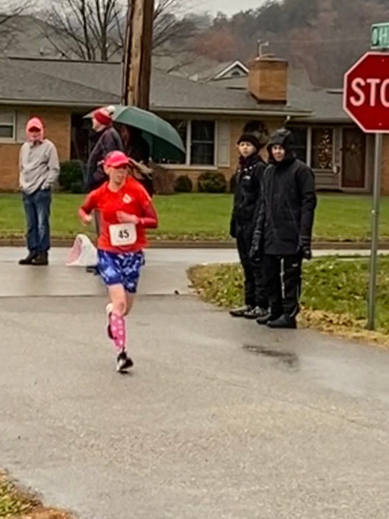 You start off with a downhill, but immediately go back up…then back down…then the hardest climb back up. This road is fun on Thanksgiving because the people who live in the houses lining the street come out and cheer. And even though it was POURING down rain…this still happened. And it made me smile. And when you smile…you run better, right? Sure. Lets go with that.