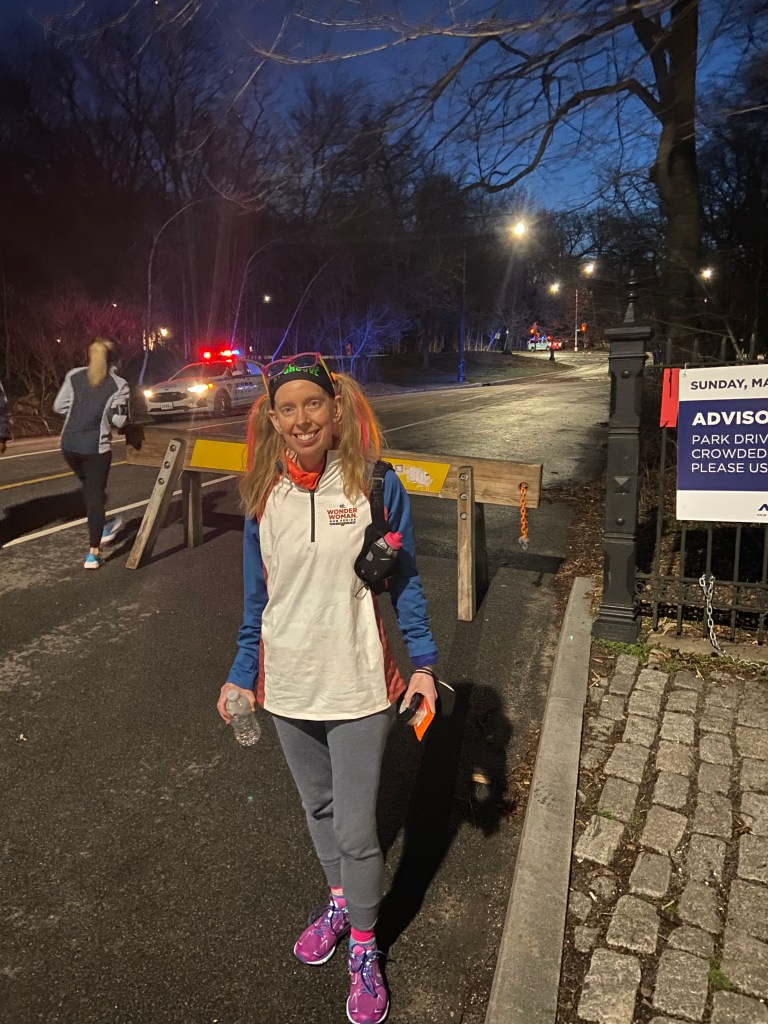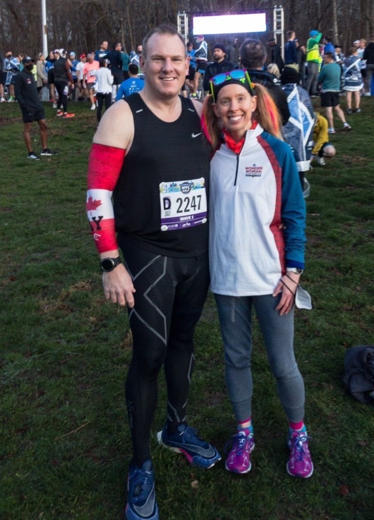 When we were here in 2018, we took the subway to Brooklyn and ended up packed like sardines in the train car. With Covid-19 still being a thing, we opted to skip the subway ride to Prospect Park, and instead hired a car to take us there. It was an easy drive in, and we went across the Brooklyn Bridge, which was really cool. They dropped us off across the street and we went to sit down on a bench for a little bit, since we were still a little early. I brought my pre-race fuel to eat on the walk to the start, but Cathy went ahead and had her breakfast while we waited and chatted and watched some warmers do some strides or get some easy miles in ahead of the race. After a little while, I needed to head into the park and to the corrals…so Cathy went to catch the subway to the Manhattan Bridge and I went to go find some friends inside the park.