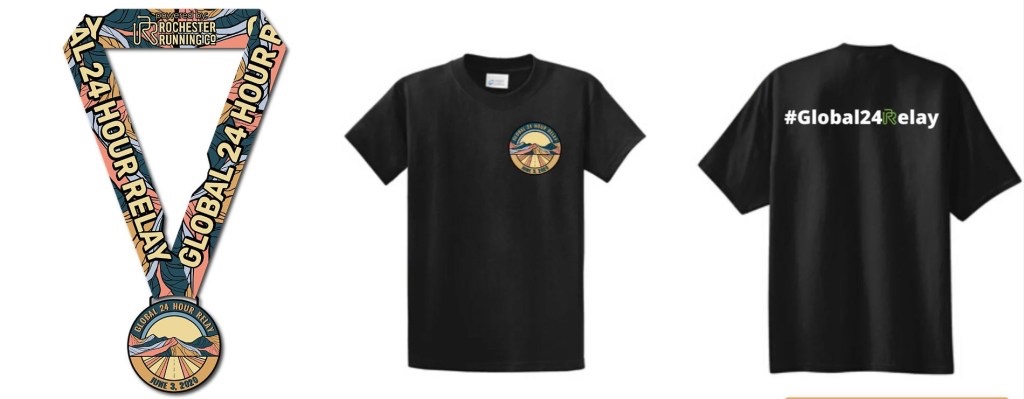 And what do you get for participating in this Global 24 Hour Relay? Well, beside the obvious pride that comes along with it, you’ll receive this shirt and medal at the end of June and be entered into a few raffles from Garmin, Maurten, Goodr, and Trigger Point.