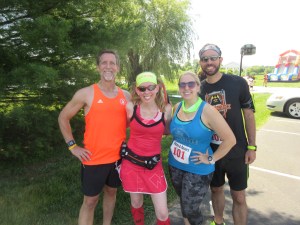 That morning, I ate my cereal and got my Honey Stinger Gel tucked into the zipper pocket of my shorts. As it was humid out, I drank down 20 ounces of water, and prepped 16 more to take with me in the car with a NUUN tablet in it for extra electrolytes. I tucked my Owyn Dark Chocolate Protein Shake into a cooler to keep it cool so I could have it about 30 minutes before the start of the race…and Cathy got up and got ready and we were out the door and being picked up by our friends Melissa and Paul to head to the Parklands. The race started at the Egg Lawn, and I was a bundle of nerves, let me tell you.