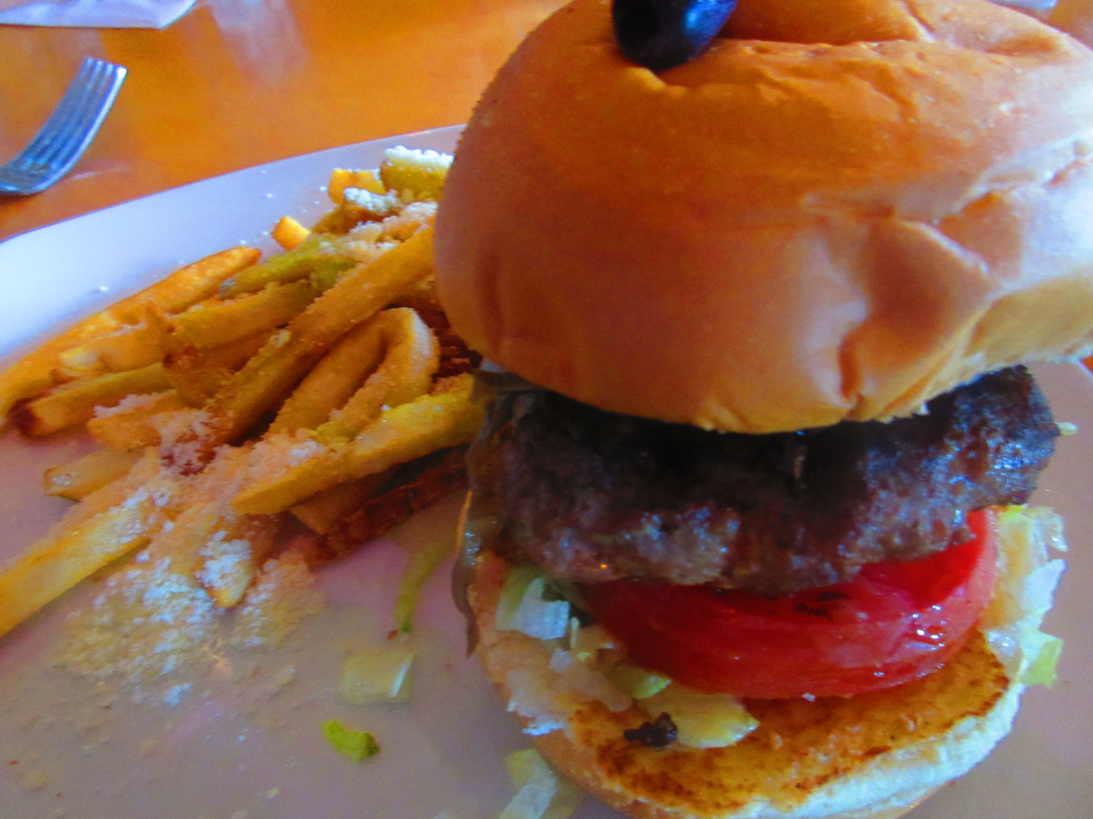 Cathy’s Mythos Signature Burger with Lamb ($14.99) with the Parmesan Fries (+ $0.50) looked fantastic and perfectly cooked. The bun was huge, encompassing the burger and all the toppings that came on it. This included grilled onion, shredded lettuce and fresh tomato topped with feta-olive aioli. She was nervous about the feta-olive aioli, but loved it. She found the burger to be a little dry (NOT LAMB!), but it was well cooked and full of flavor. While the patty was thick, it was way smaller than the bun. To this day, though, she raves about the “killer” feta-olive aioli. She almost missed out on it as she doesn’t love olives at all…but it worked. And now, I think she’s smitten. She ate every bit of that burger. And the Parmesan fries were “good.” she said. The cheese, both of my dining compatriots said, needed to be melted so that they stuck to the fries rather than just sprinkled on top. Otherwise, the cheese fell off the fries.