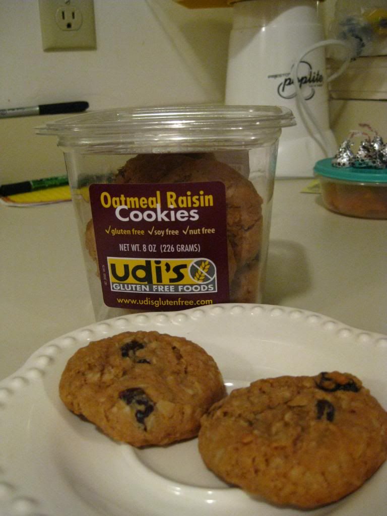 I was over in Louisville, Kentucky one day and happened across a grocery store. My roommate and I love to shop manager’s specials so we ducked inside. We found a few practical things, but there…near the back of the store, was a small wooden stand that was populated with Udi’s gluten-free bread, granola…and COOKIES! Since I had already tried the chocolate chip variety, I was down to either the oatmeal raisin or the snickerdoodles. I was feeling the oatmeal raisin that day (although, granted, this has never been my favorite type of cookie to choose from), so that was the splurge purchase of the day. Let’s face it…when you can’t get Udi’s cookies in your area, you buy them when and where you can.