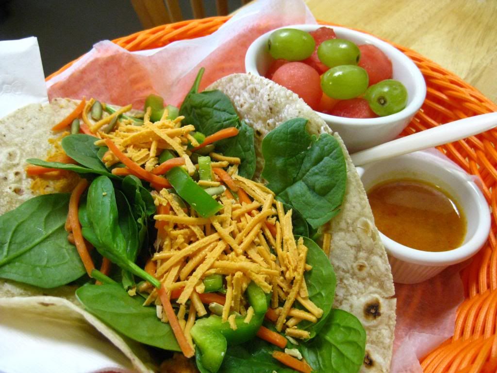 Earth Friends Café's Veggie Wrap (on a gluten-free wrap w/ Daiya vegan cheese) with seasonal fruit