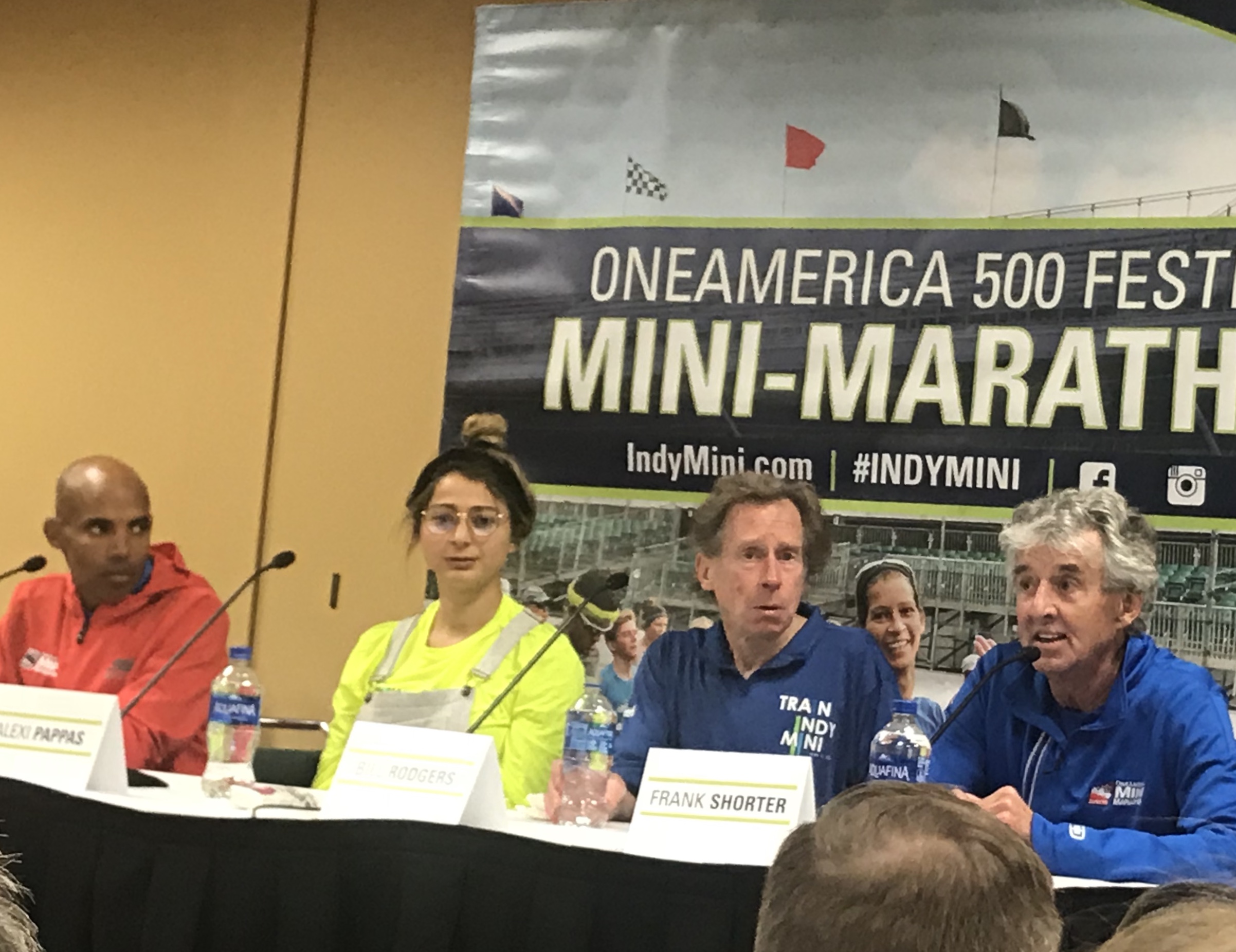 Melissa asked me if Bill Rodgers book was worth buying, and I told her definitely. So she asked if she could get into the back of his line for an autograph. We had thought of doing this earlier, but Cathy had overheard one of the handlers say that he was just signing books…but the man ahead of Melissa had his Boston Marathon shirt so she looked at me and said, “Do you want Bill Rodgers to sign your medal too? He’s a four time Boston Marathon champion.” I took my medal from her and went to stand with Melissa. This worked out because it meant I could take photos with her and Bill and she could return the favor for me. Bill was awesome. He recommended to Melissa that she run Chicago Marathon and she told him she was this year. And he wouldn’t let up on how amazing the crowd support is there and how amazing the race is (everything I have touted all along) and as I was taking their picture, he apparently kept whispering “Chicago. Chicago. Chicago.” in her ear. HA! My turn. I brought him my medal and I told him my Boston story. When I told him about my hip labrum tear, he said, “That’s a bad injury. Did you have to have surgery?” I told him no. He said, “Lots of physical therapy.” I nodded. “So much physical therapy!” He signed my medal and graciously took a photo with me and wished me luck in Chicago this year too. Melissa and I went to duck back into our spots at Meb’s line.