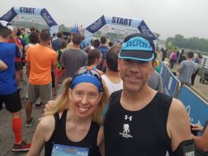We set alarms for 6 am. And race morning dawned and alarms went off. We went with the bathroom circuit that we’ve established since the NYC Half Marathon. I grabbed my stuff and went to change into my shorts and tank before coming out and allowing the next people to work their way through. I always use the bathroom one last time before leaving the hotel. I realized I didn’t eat anything leading up to this…or take in some water. So…that was that working against me. I did have a banana, which I ate as we made our way to the lobby, as we were 30 minutes out from the start of the race. I know better than to JUST eat a banana before a distance race. A shorter race it would be fine…but not for a half or full marathon.