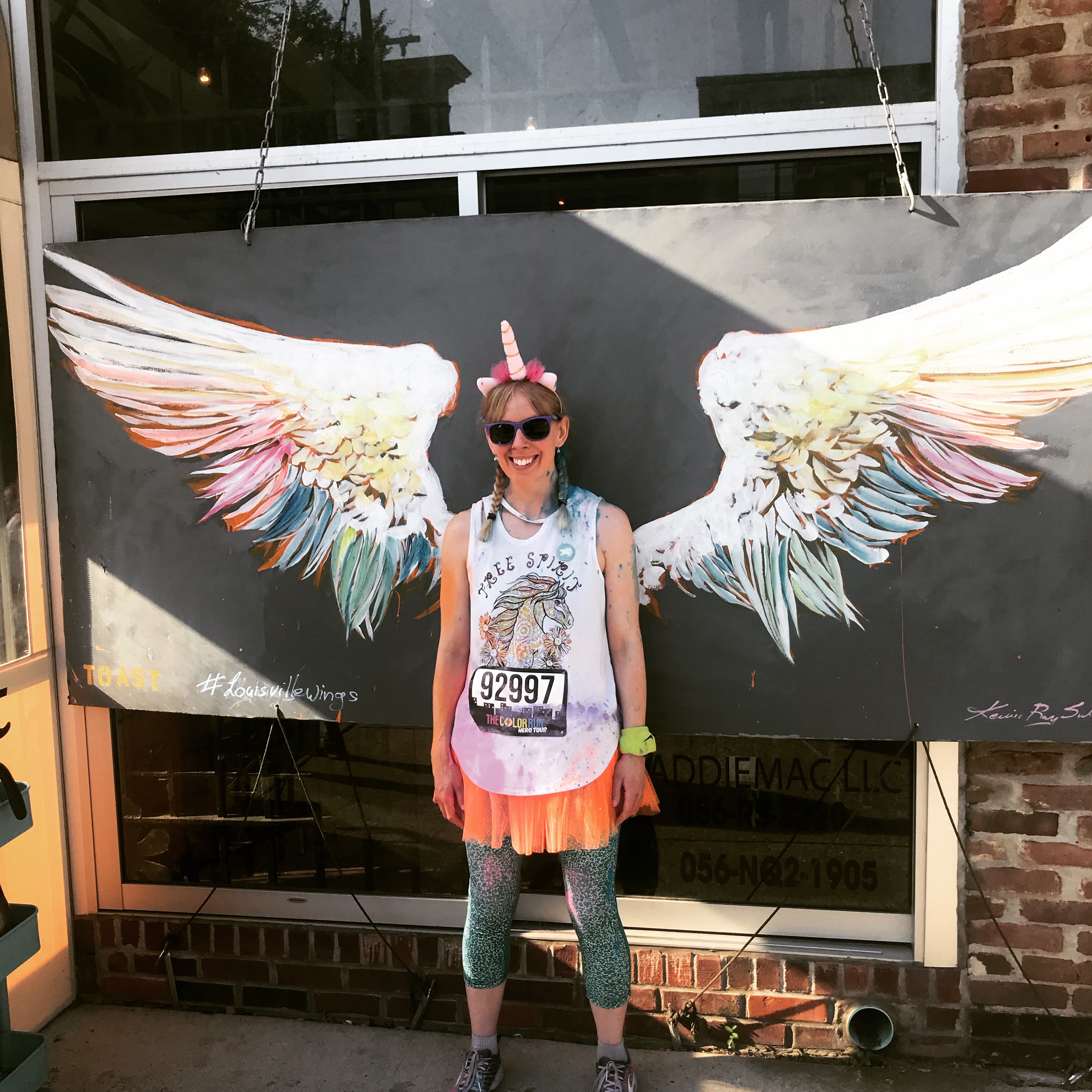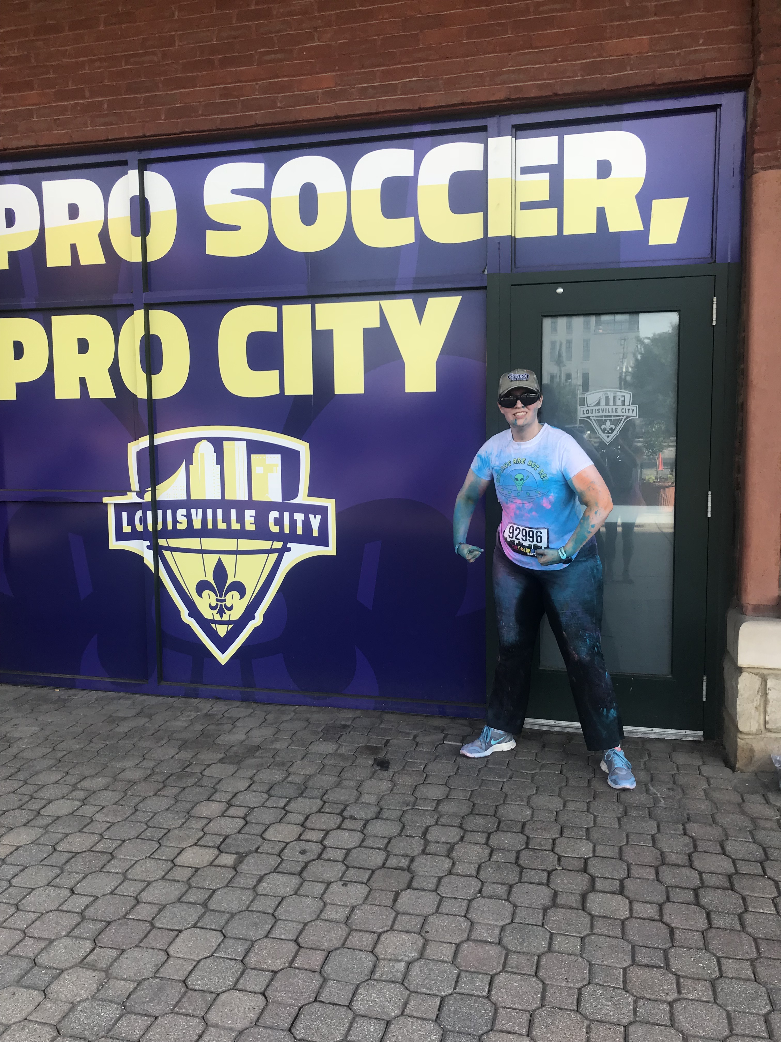 This left the long haul back toward the finish line, which was back at Waterfront Park. The green zone would be last. But along the way, we stopped at Toast on Market to take photos with the wings and then Cathy stopped at Slugger Field to get a shot with the Louisville City FC signage. Apparently on the way to green, the Red Bull girls were out and Cathy saw a 10 year old rush by with a Red Bull screaming “I GOT ONE!” Lord, have mercy! We went through green…hit up the foam zone, and grabbed hands with our teammates and walked through the finish line together.