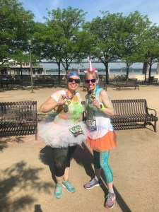 Me and Melissa with our superhero unicorn medals for finishing The Color Run!