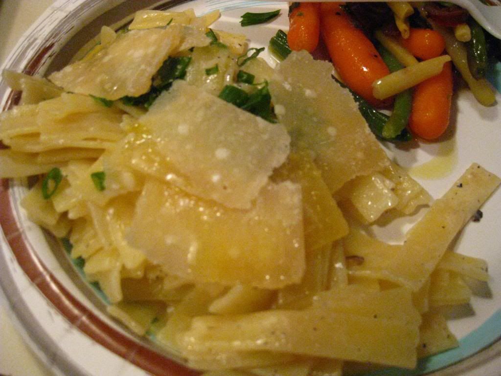 Serve the pasta in shallow bowls and garnish each serving with a generous sprinkling of chives and shaved Parmesan. Sprinkle with salt and pepper and serve at once.