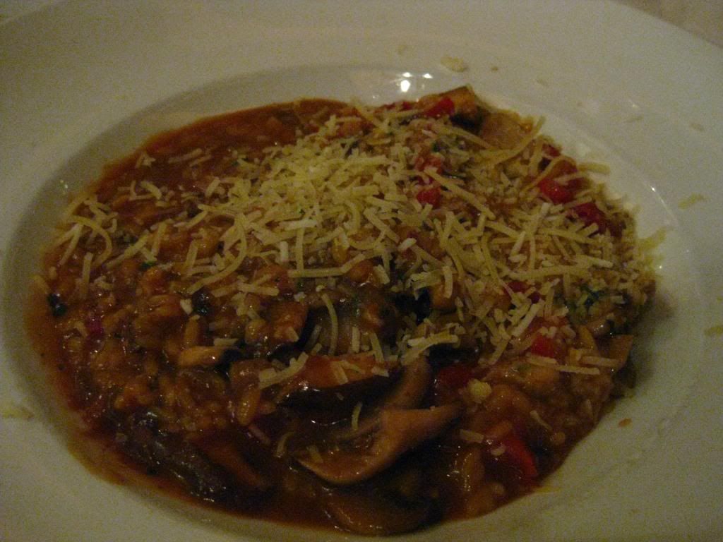 Since I am a gluten-intolerant vegetarian, the normal go-to for vegetarians (pastas!) were not an option for me. What I ended up ordering was exactly what I wanted, however. The Risottino Con Funghi ($22.95), which consists of Arborio rice with saffron, tossed with wild mushrooms and adorned with freshly grated Parmigiano Reggiano cheese. The risottos are on the menu as an appetizer, but the waitress said it could be prepared at an entrée size. I was quite pleased with this. I was even more surprised when, after a wait and some good conversation, our waitress and waiter (he was training) came to our table with pans and a cart. The burners were lit, and the food was finished off table side. What a treat. I got to see the risotto get tossed, warmed, and then plated right in front of me. My roommate’s ravioli prepped the same way. I love this stuff! The risotto was placed in front of me and then dusted with a nice helping of freshly grated Parmigiano Reggiano cheese (only the best!). We were then left to our food.