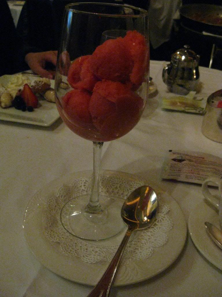 Our waiter inquired with us after we finished out dessert. We did say we would love to look at the menu. The dessert menu, mind you, is a tray that is plated with the desserts being offered that evening. This consisted of a variety of cakes and pies as well as a trio of cannoli. Not much there for someone with my food allergies. And yet, when this was mentioned, our waiter immediately said that ice cream and sorbets were available as well. I was pleased with this choice and while my roommate opted for cannoli, I treated myself to a sorbet ($8.50). The waiter gave me a flavor choice of lemon or orange. I almost chose lemon, but opted for orange. After the dessert order was placed, the waiter returned a moment later to apologize, letting me know that they did not have orange sorbet that evening, but it was raspberry. Fine by me…I was quite happy to go with raspberry instead.