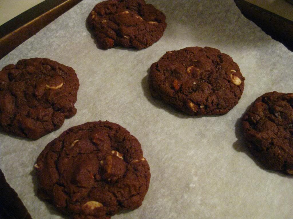 What’s better than chocolate? Double chocolate. Oh…and these cookies are amazing. The recipe is adapted from one that I saw prepared by the Barefoot Contessa. Curse you Food Network for making me crave. Then again, after making up a batch myself (which, I admit, I used three different kinds of chocolate chips…white, semi-sweet, and dark), I can’t curse the network that showed these to me. They are fantastic. A bit of crunch with a soft core. Yeah…epic yum.