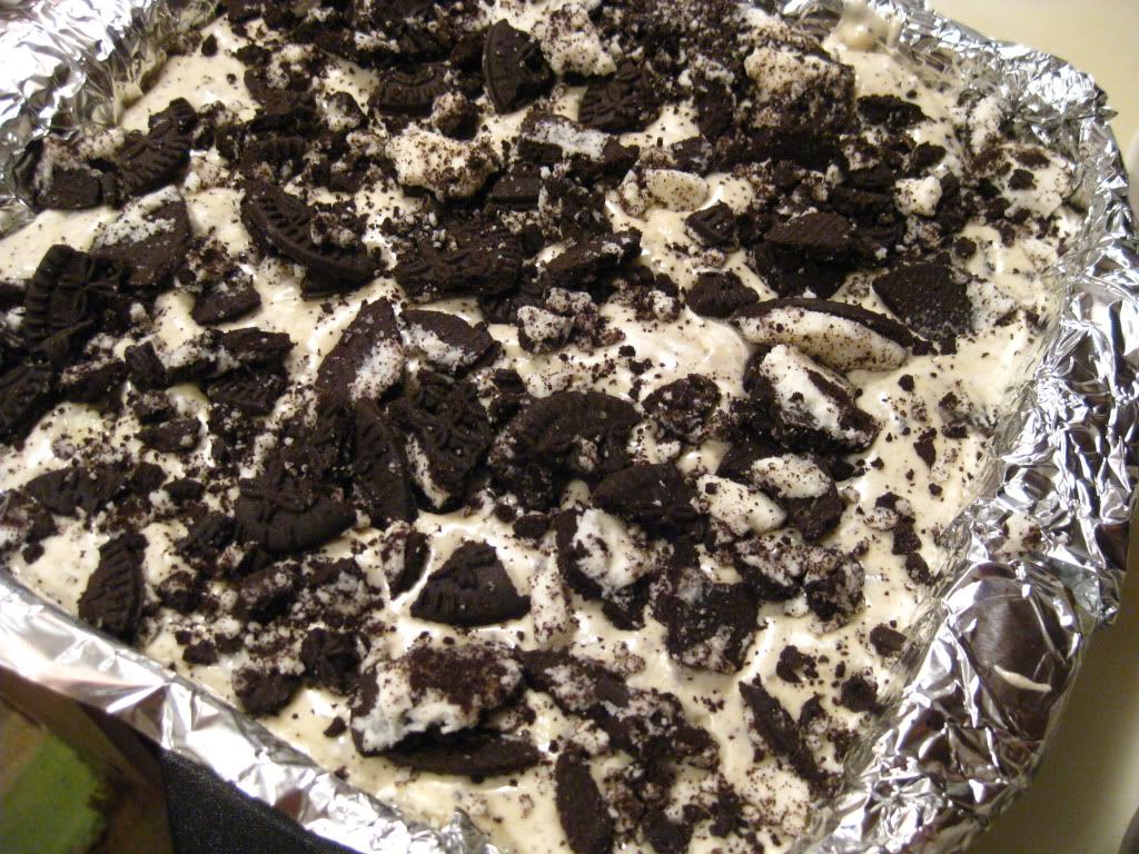 Pour fudge into prepared pan. Sprinkle remaining 1 cup cookies over fudge, gently pressing cookies into fudge. Cover and chill until firm.