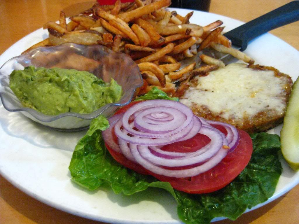 My roommate settled on the Ribeye Sandwich ($8.99) and I opted for the Garden Burger ($7.99). And yes, this vegetarian patty is completely gluten-free. (Cue the sound of angels singing now!). I, naturally, ordered it without the bread, with the side of fries. The actual sandwich itself is served with lettuce, tomato, onion, cheese and guacamole.