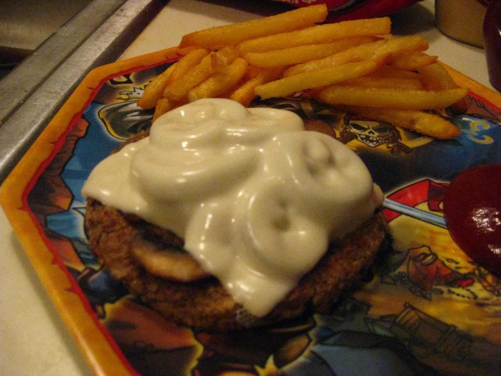 Amy's Kitchen Sonoma Veggie Burger, topped with sauteed mushrooms and a slice of melted non-dairy Swiss cheese and served with a side of Ore Ida's Extra Crispy Fast Food Fries
